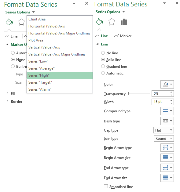 Now we have to change the Low, Average and High series. For each one, set Marker to “None”, Line width to 15 pt and Cap type to Flat.