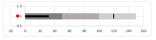 Those are the background series. Now we have to add the target value and the actual value. Add them exactly as you did for the previous series. Then, we have the alarm. The alarm is not in the original specifications but, since we will need to call the reader’s attention to abnormal values, adding an alarm to the bullet chart is an elegant way to do it. In this example, there is a rule in cell H4 that returns an error if the Actual value is above the upper limit of the Low range: “=IF(G4<C4,-10,NA())”. This means that the alarm is not visible if the formula returns an error. The alarm will be displayed to the left of the chart, at value -10 (we can change this).